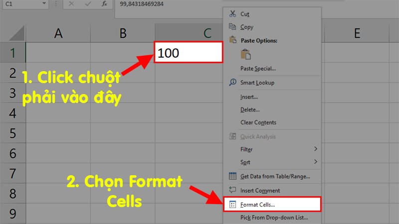 Click chuột phải vào ô Excel cần bỏ làm tròn số > Chọn Format Cells...