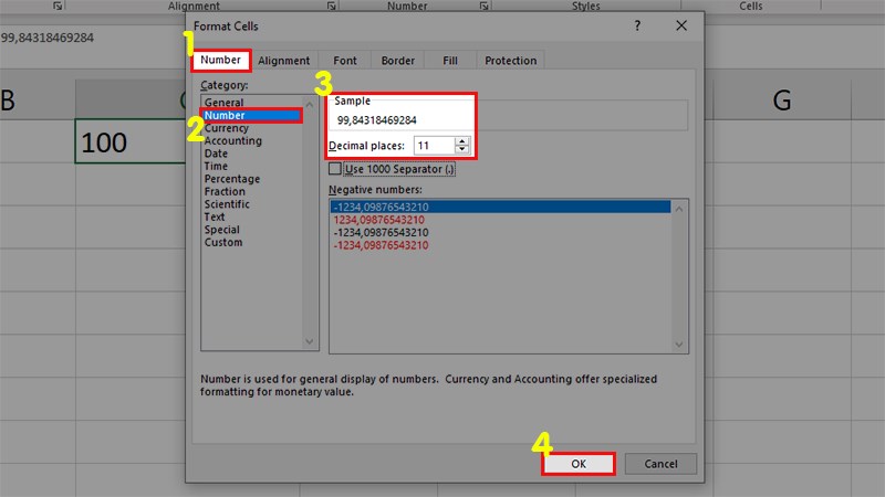 Bước 2: Ở hộp thoại hiện ra > Chọn thẻ Number > Mục Number > Bạn nhập số chữ số sau dấu phẩy muốn hiển thị tại mục Decimal places > Nhấn OK để hoàn tất cài đặt.