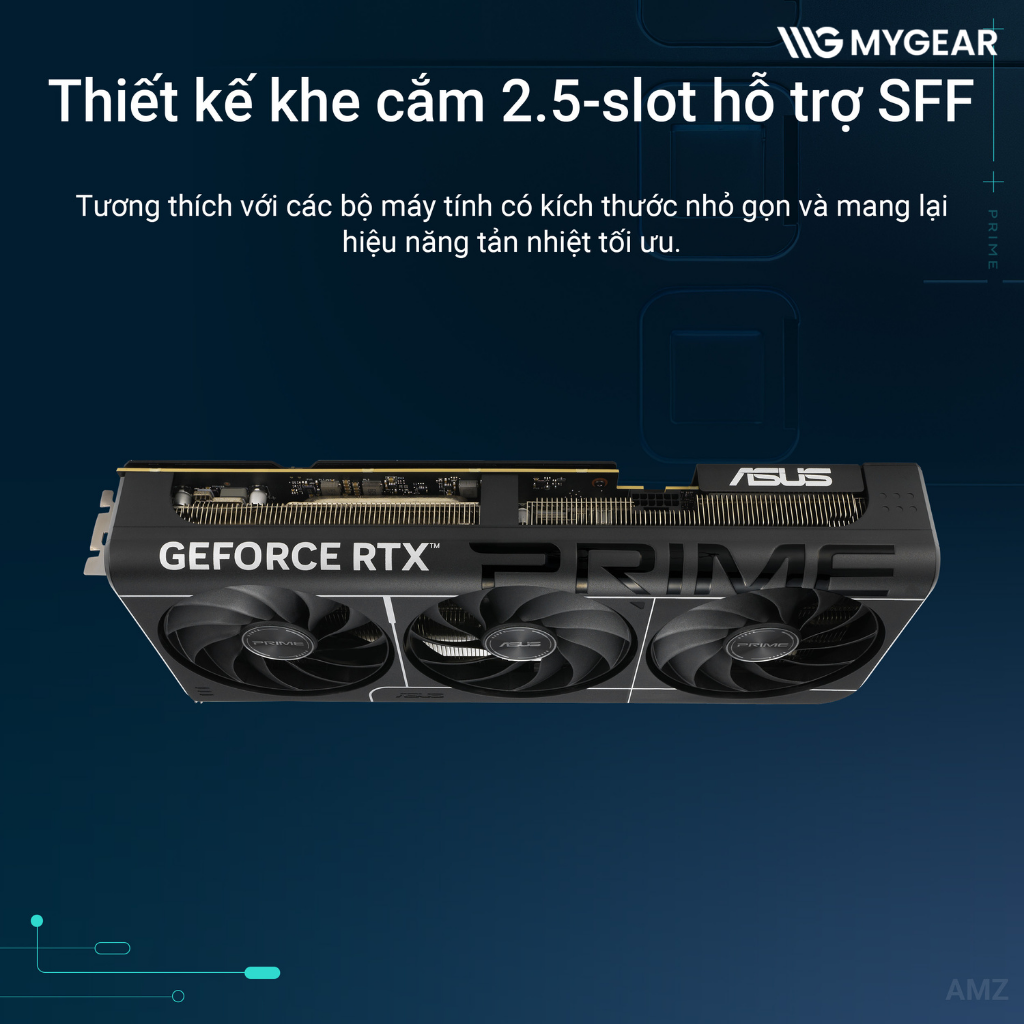 ASUS PRIME RTX 5070 Ti OC Edition có kích thước 304 x 126 x 50 mm, độ dày 2.5 slot, hỗ trợ chuẩn SFF Ready. Điều này giúp card dễ dàng lắp đặt trong nhiều loại case, kể cả các hệ thống nhỏ gọn. Thiết kế tối ưu giúp cân bằng giữa hiệu năng và khả năng tương thích.