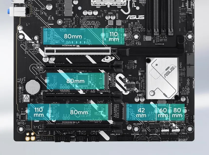 Bo mạch chủ ASUS PRIME Z890-P-CSM cung cấp tổng cộng 4 khe M.2, trong đó 1 khe hỗ trợ tốc độ truyền dữ liệu lên đến 128Gbps thông qua PCIe 5.0 và 3 khe hỗ trợ 64Gbps thông qua PCIe 4.0. Tốc độ truy xuất dữ liệu nhanh giúp cho phản hồi của các ứng dụng trở nên mượt mà hơn.