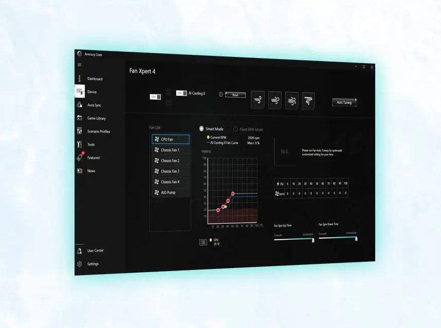 Các giải pháp AI của ASUS bao gồm AI Advisor đóng vai trò như chuyên gia kỹ thuật của bạn với chuyên môn tối ưu hóa hiệu suất PC, cùng với AI Cooling II để tự động kiểm soát nhiệt độ hệ thống.