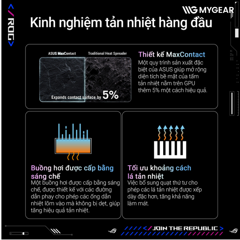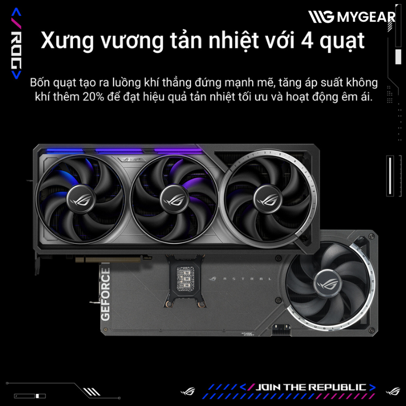 Hệ thống tản nhiệt trên ASUS ROG Strix Astral GeForce RTX 5080 được thiết kế đặc biệt để giữ nhiệt độ hoạt động luôn trong ngưỡng an toàn. Công nghệ tản nhiệt Quad-Fan giúp điều chỉnh quạt theo nhu cầu thực tế của GPU, từ đó tối ưu hóa hiệu suất mà không gây tiếng ồn khó chịu. Đây là yếu tố cực kỳ quan trọng cho những game thủ hay làm việc trong môi trường yên tĩnh và cần sự tập trung.
