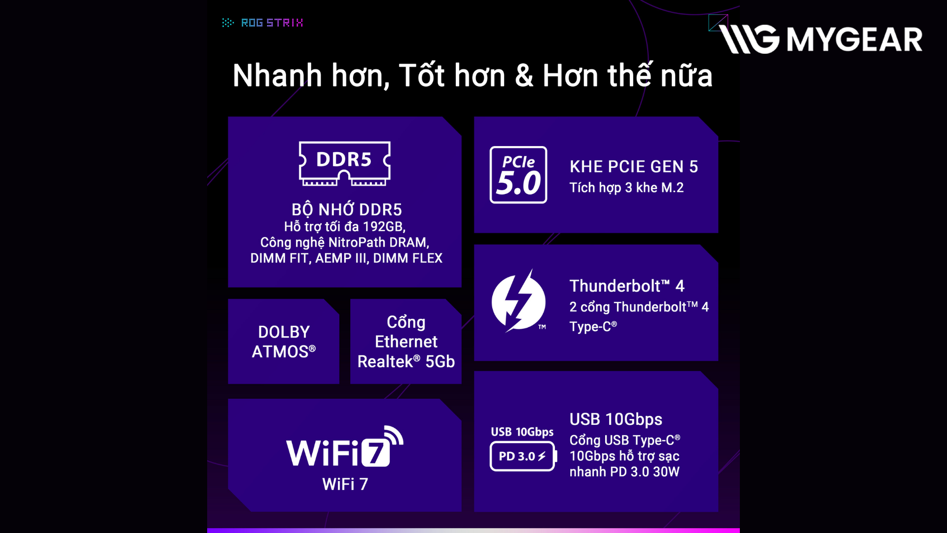 Mainboard ASUS ROG STRIX Z890-E GAMING WIFI DDR5 mang lại sự cân bằng tốt giữa hiệu năng, mở rộng và kết nối. Hệ thống 7 khe M.2 đặc biệt hữu ích cho người dùng lưu trữ nhiều game hoặc dự án lớn. Khả năng hỗ trợ DDR5 8800+ MT/s và PCIe 5.0 giúp hệ thống luôn sẵn sàng cho phần cứng thế hệ mới. Kết nối 5Gb LAN và Wi-Fi 7 đảm bảo tốc độ mạng nhanh và ổn định. Đây là một bo mạch chủ Gaming ASUS phù hợp cho game thủ cao cấp, streamer hoặc người làm nội dung muốn một nền tảng mạnh mẽ nhưng vẫn linh hoạt nâng cấp.