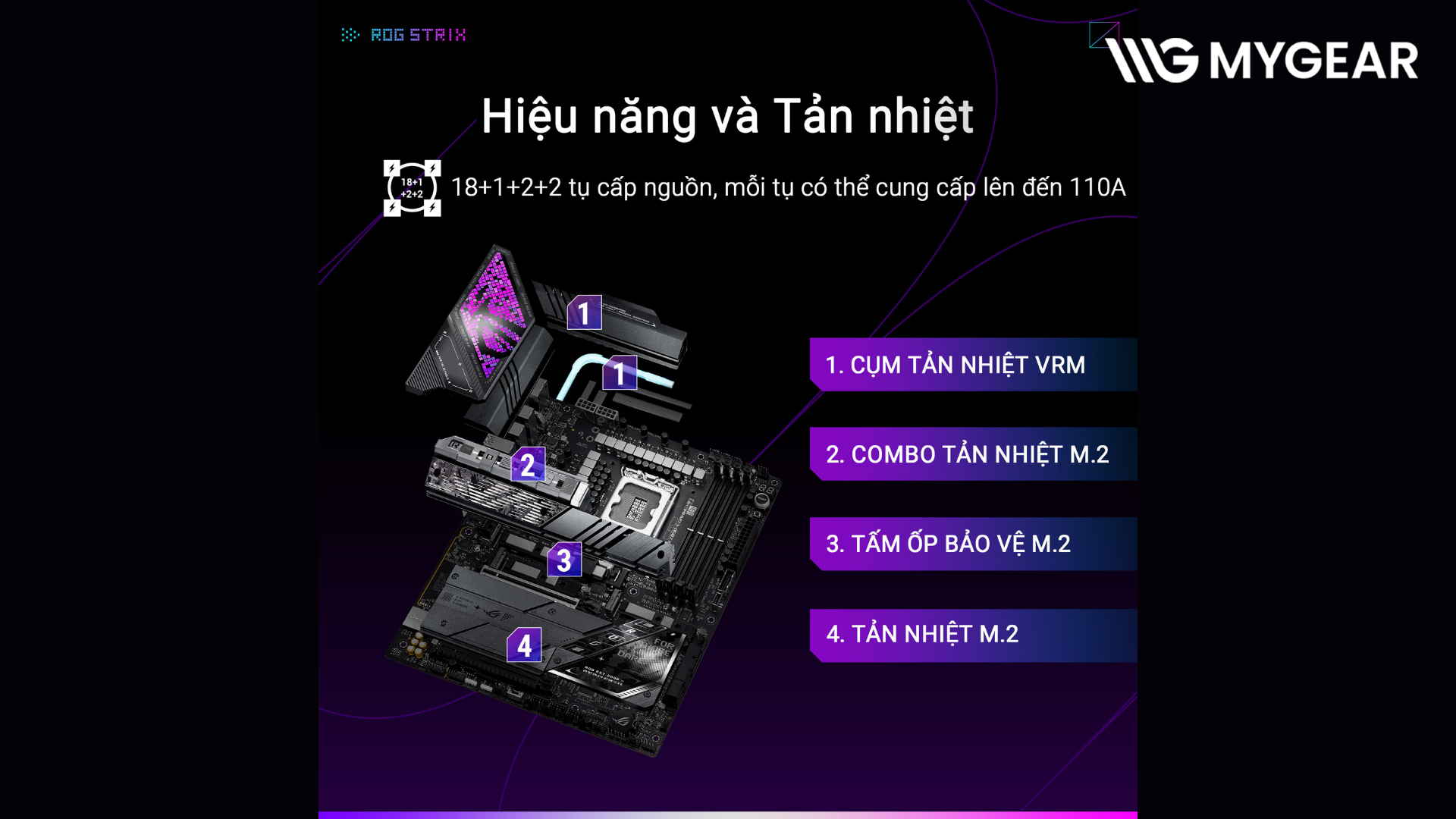 Bo mạch chủ được trang bị 1 khe PCIe 5.0 x16 từ CPU và 1 khe PCIe 4.0 x16 từ chipset. Điều này đảm bảo khả năng khai thác tối đa sức mạnh của các card đồ họa thế hệ mới. Với cấu hình như vậy, mainboard ASUS ROG STRIX Z890-E GAMING đáp ứng tốt nhu cầu gaming 2K, 4K và cả các hệ thống sử dụng GPU cao cấp cho công việc đồ họa.