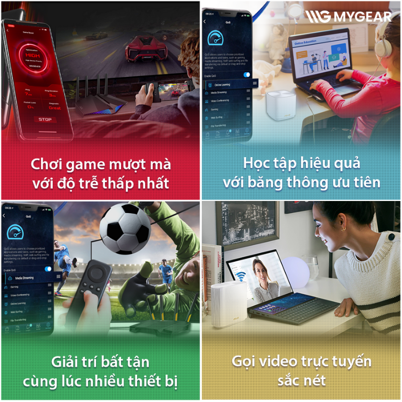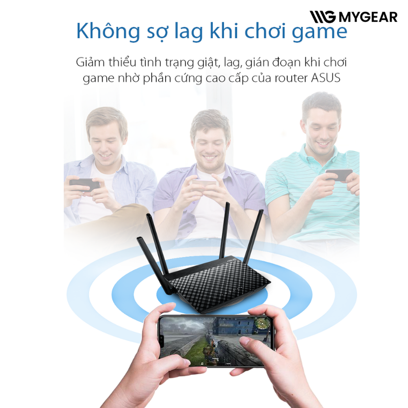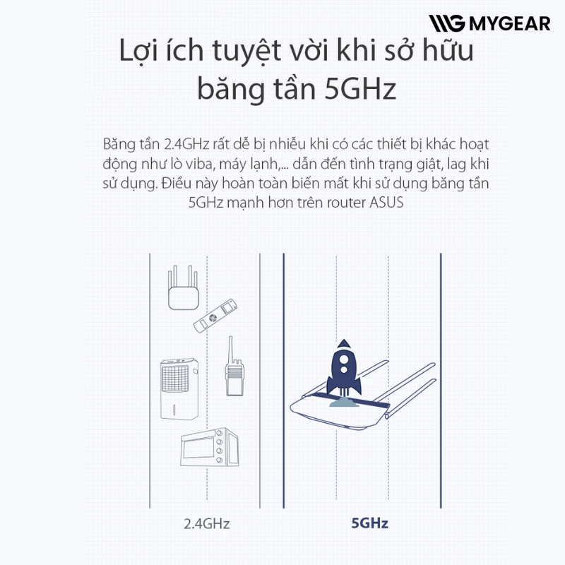 Router ASUS 2 băng tần cho phép bạn sử dụng băng tần 2.4GHz để truy cập Internet cơ bản như lướt web, đọc tin và băng tần 5GHz cho các hoạt động yêu cầu băng thông cao như stream, game hoặc tải dữ liệu lớn.