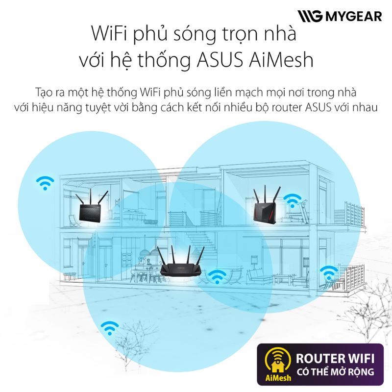Một trong những tính năng nổi bật nhất của ASUS RT-AX58U AiMesh là khả năng kết nối nhiều router ASUS tương thích để tạo thành mạng WiFi Mesh toàn diện. Điều này giúp mở rộng vùng phủ sóng WiFi đến từng ngóc ngách trong nhà, loại bỏ hoàn toàn điểm chết WiFi mà không cần thiết bị mở rộng riêng biệt.
