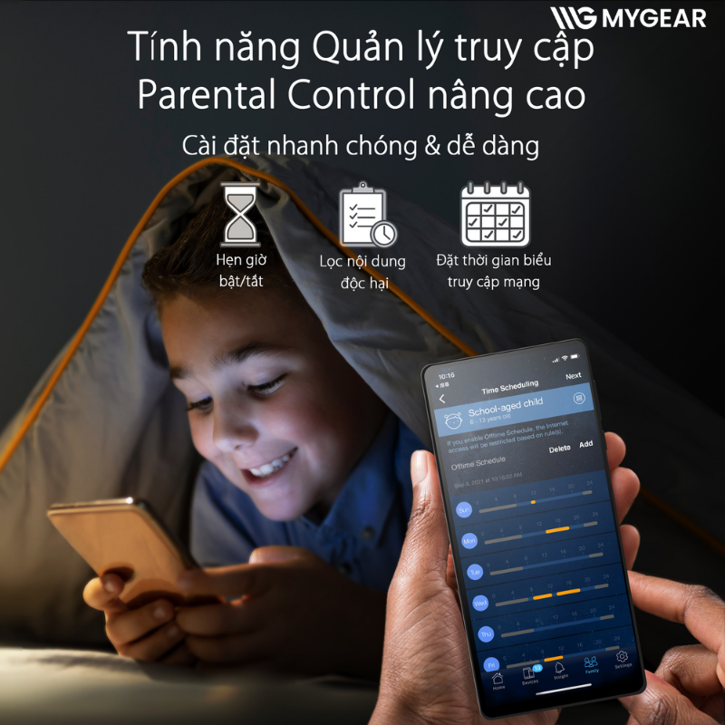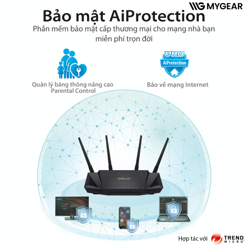 ASUS trang bị cho router WiFi 6 ASUS RT-AX58U hệ thống AiProtection do Trend Micro cung cấp, giúp bảo vệ mạng khỏi các mối đe dọa mạng độc hại, ngăn chặn truy cập nguy hiểm và bảo vệ dữ liệu cá nhân của người dùng. Ngoài ra, tính năng Parental Control cho phép cha mẹ quản lý thời gian truy cập Internet, chặn nội dung không phù hợp, cực kỳ hữu ích cho gia đình có trẻ nhỏ.