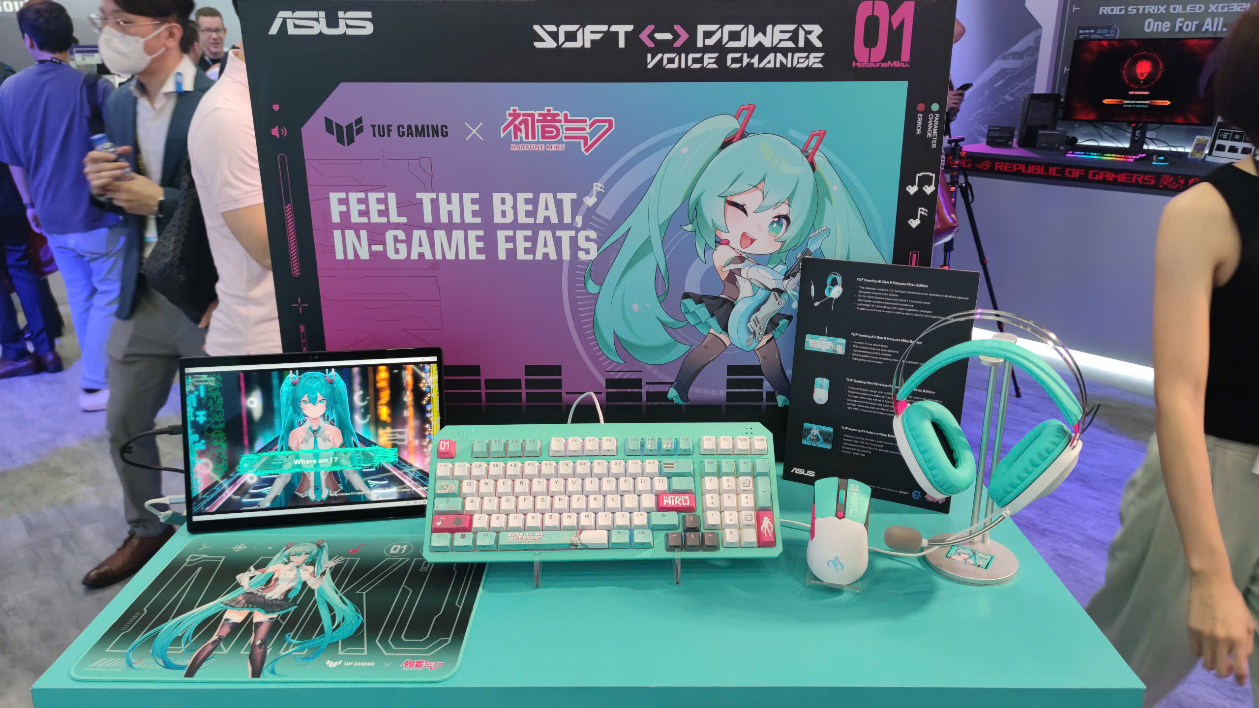 Bộ sưu tập phụ kiện gồm tai nghe H1 Gen II, chuột Mini Wireless, bàn phím K3 Gen II và lót chuột P1, tất cả mang màu sắc đặc trưng xanh lam – hồng của Miku, kết hợp cùng thiết kế TUF Gaming mạnh mẽ, cá tính.