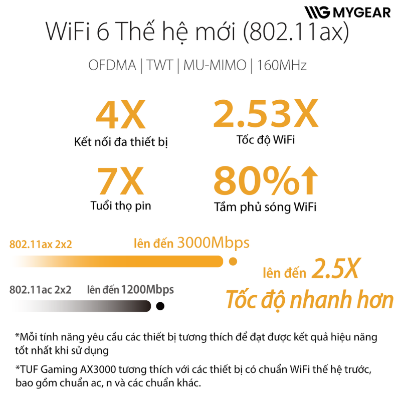 | Tăng tốc | OFDMA (Orthogonal Frequency Division Multiple Access - Truy cập nhiều phân chia tần số trực giao) Tạo chùm tia: đa năng và theo tiêu chuẩn Tốc độ truyền tải dữ liệu cao 1024-QAM Băng thông 20/40/80/160 MHz |