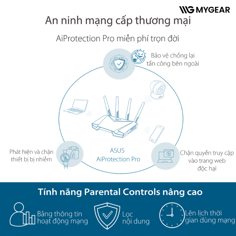 Router gaming ASUS TUF được tích hợp AiProtection Pro, một hệ thống bảo mật cấp doanh nghiệp do Trend Micro cung cấp, giúp bảo vệ mạng khỏi virus, tấn công DDoS và các mối đe dọa khác. Ngoài ra, tính năng Parental Controls cho phép giới hạn truy cập Internet, thiết lập thời gian online và lọc nội dung không phù hợp, rất tiện lợi cho gia đình. Giao diện ASUS Router App thân thiện, giúp người dùng kiểm soát băng thông, bật chế độ Gaming Mode hoặc theo dõi thiết bị đang kết nối chỉ trong vài giây.