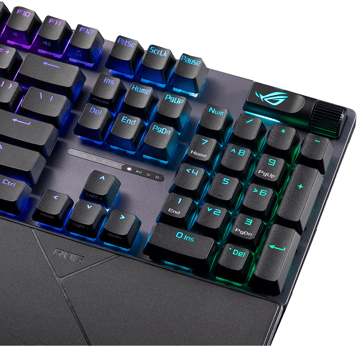 | Tính năng nổi bật | Thiết kế chống nước và bụi chuẩn IP57, foam giảm âm tích hợp, nút đa chức năng và bánh xe điều chỉnh, hotkeys cho Xbox Game Bar và chức năng ghi âm, bộ nhớ tích hợp lưu trữ cấu hình, phím macro có thể lập trình, hỗ trợ phần mềm Armoury Crate, đệm cổ tay tháo rời |
