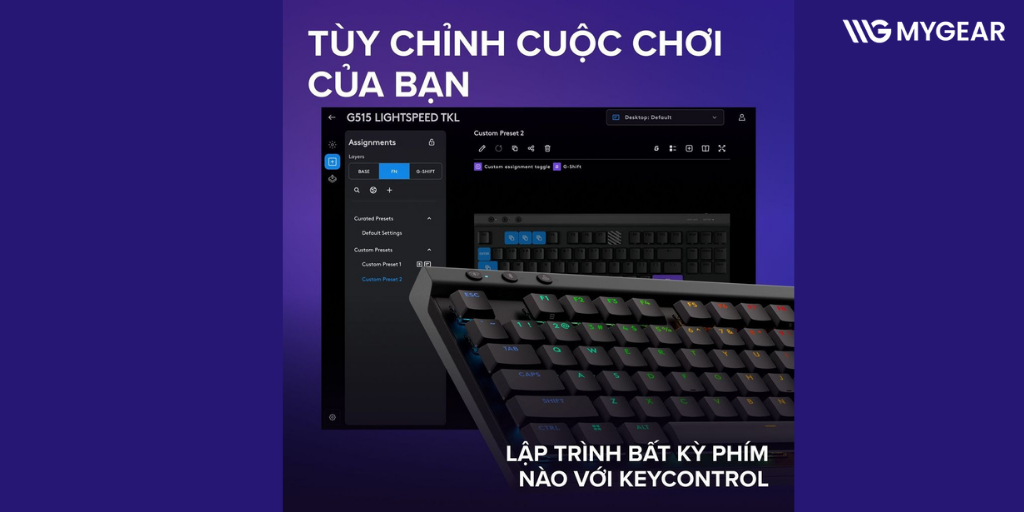 Khi sử dụng G515 Lightspeed, người dùng có thể dễ dàng điều chỉnh âm lượng, chuyển bài hát, thay đổi ánh sáng hay cấu hình macro nhanh chóng thông qua cụm phím chức năng thông minh. Thông qua Logitech G HUB, bạn có thể tùy chỉnh từng phím, gán macro, thiết lập chế độ ánh sáng và đồng bộ hóa thiết bị trong cùng hệ sinh thái Logitech.
