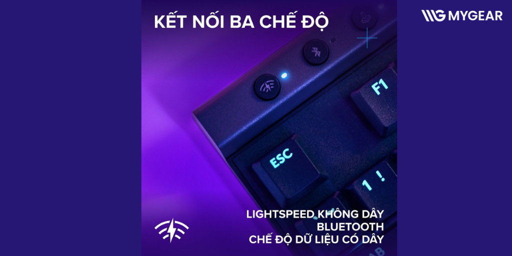 Công nghệ Lightspeed Wireless độc quyền của Logitech đảm bảo đường truyền tín hiệu siêu ổn định, tốc độ phản hồi nhanh như bàn phím có dây. Đây là yếu tố quan trọng giúp G515 Lightspeed trở thành lựa chọn hàng đầu cho các game thủ cần độ chính xác tuyệt đối trong từng pha combat. Ngoài ra, bàn phím còn hỗ trợ kết nối Bluetooth, giúp bạn dễ dàng chuyển đổi giữa nhiều thiết bị như PC, laptop, máy tính bảng hoặc điện thoại chỉ với một nút bấm.
