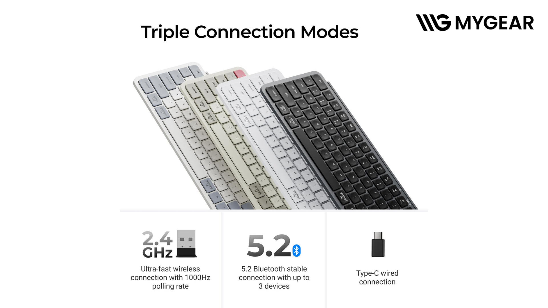 Với kết nối đa dạng Bluetooth 5.1, Wireless 2.4 GHz và USB-C tháo rời, cùng pin dung lượng lớn, Keychron B1 Pro Ultra Slim Wireless đáp ứng nhu cầu làm việc di động và setup minimal. Tại MYGEAR, bạn có thể kết hợp bàn phím Keychron B1 Pro với các phụ kiện như keycap thay thế, wrist rest, chuột chơi game hoặc các thiết bị Bluetooth khác để tối ưu trải nghiệm gõ phím.