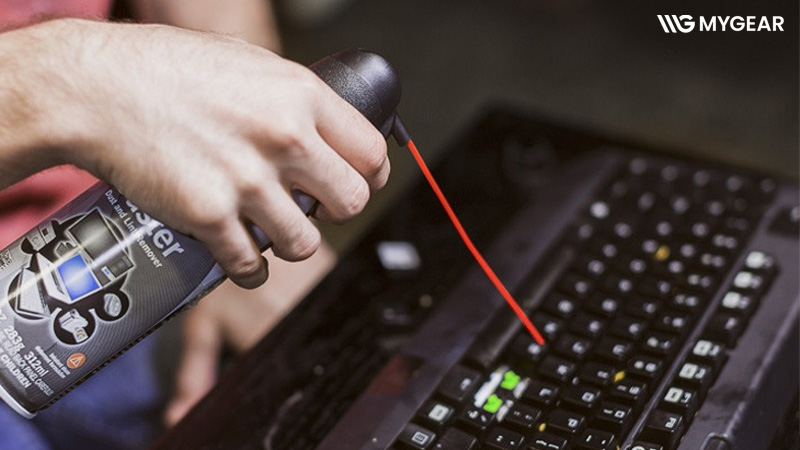- Sử dụng bình khí nén xịt nhẹ quanh các khe phím để thổi bụi ra ngoài.