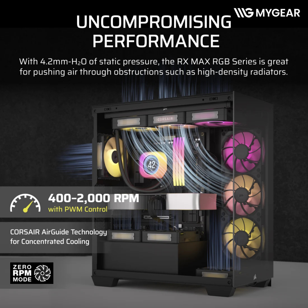 Ở tốc độ cao, quạt làm mát Corsair RX120 đạt đến 71.3 CFM cùng 4.16 mm-H2O, đảm bảo mức làm mát mạnh mẽ cho CPU, card màn hình và cả hệ thống tản nhiệt nước custom.