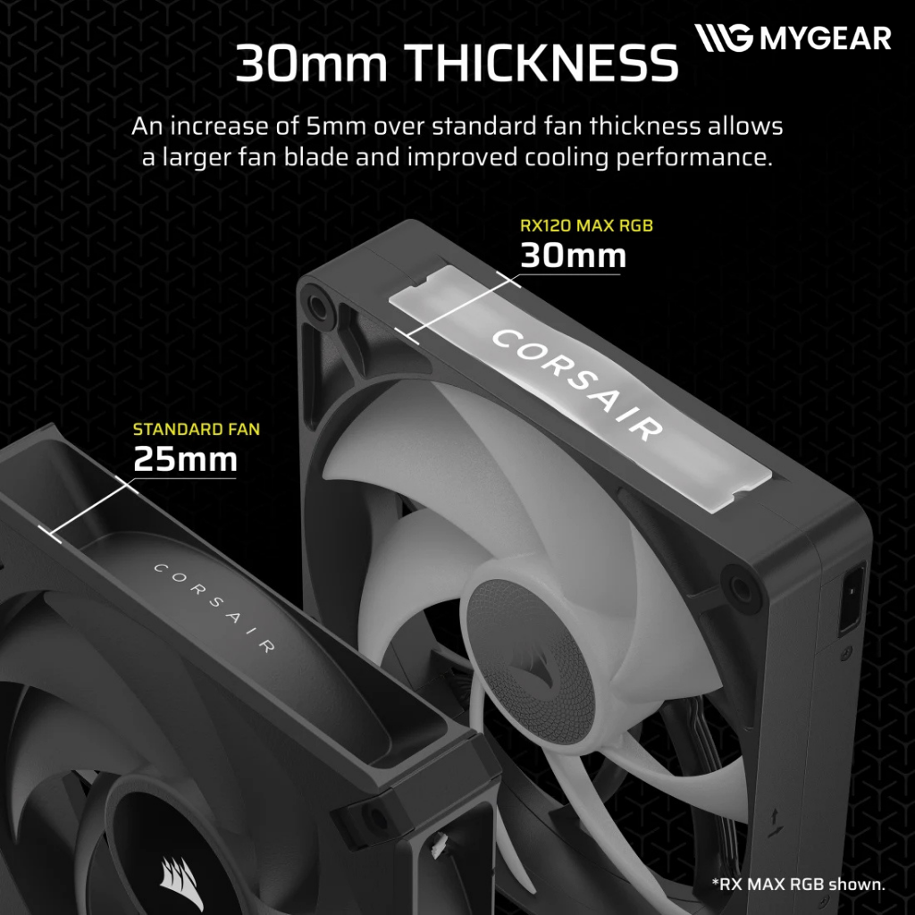 Điểm đặc biệt của fancase Corsair RX120 MAX RGB nằm ở độ dày 30mm, đem lại khả năng tạo áp suất tĩnh vượt trội. Với mức áp suất lên tới 4.16 mm-H2O, quạt dễ dàng thổi xuyên các khe radiator dày hoặc tản khí khu vực linh kiện chật hẹp.