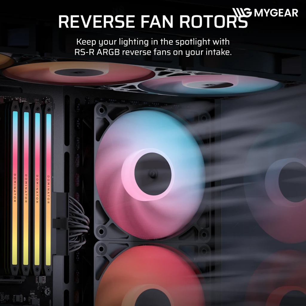 Fancase Corsair 120mm RS120-R cho phép người dùng kiểm soát luồng khí theo hướng ngược, tối ưu cho việc hút hoặc đẩy khí trong case, đồng thời tạo ra các hiệu ứng ánh sáng ARGB đồng bộ với các linh kiện Corsair khác.
