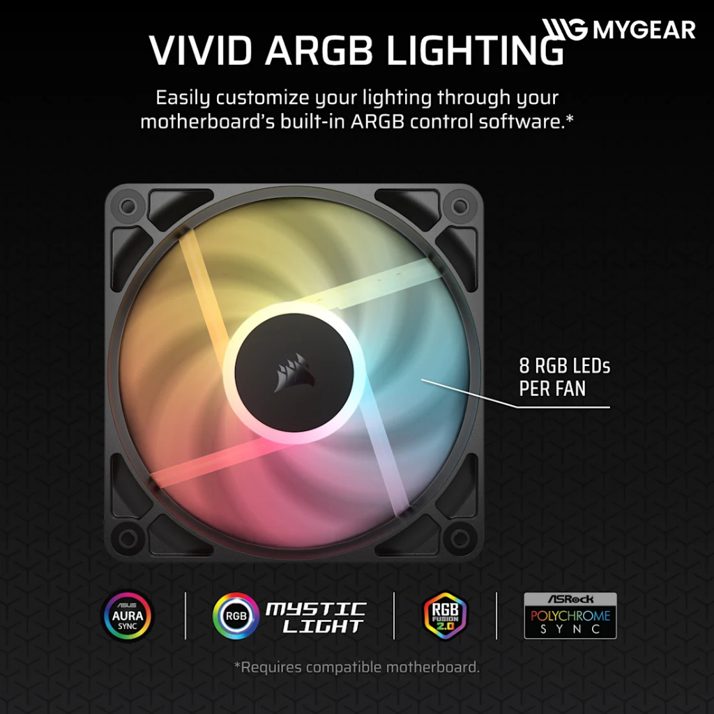 Mỗi quạt RS120-R trang bị 8 LED RGB, hỗ trợ Daisy-chain, cho phép đồng bộ hiệu ứng ánh sáng với nhiều quạt khác hoặc các linh kiện Corsair khác, tạo nên dàn máy nổi bật và hiện đại.