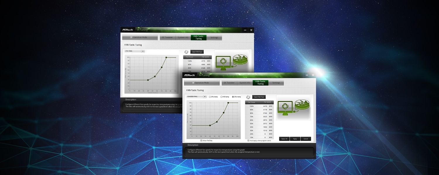 Chức năng ASRock A-Tuning Fan-Tastic Tuning cho phép người dùng tự động phát hiện nhiệm vụ tối thiểu của từng quạt chỉ bằng một cú nhấp chuột. Người dùng cũng có thể dễ dàng điều chỉnh đường cong của quạt thông qua giao diện UI trực quan, đáp ứng các yêu cầu về hiệu suất làm mát và giảm tiếng ồn của hệ thống.