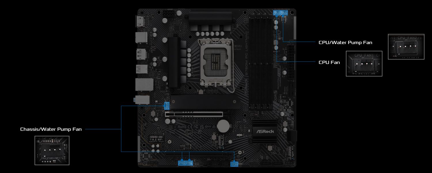 Đầu cắm quạt ASRock tự động phát hiện xem quạt đang chạy ở chế độ DC hay PWM, cho phép người dùng tinh chỉnh đường cong của quạt và đạt được hoạt động yên tĩnh hơn.