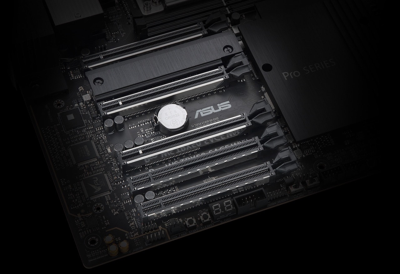 ASUS Pro WS TRX50-SAGE WIFI sử dụng PCB 12 lớp cùng các thành phần điện tử chất lượng server, giúp cải thiện khả năng dẫn nhiệt, bảo vệ linh kiện và duy trì sự ổn định khi hoạt động liên tục 24/7. Các heatsink lớn giúp làm mát VRM, SSD M.2 và chipset hiệu quả.