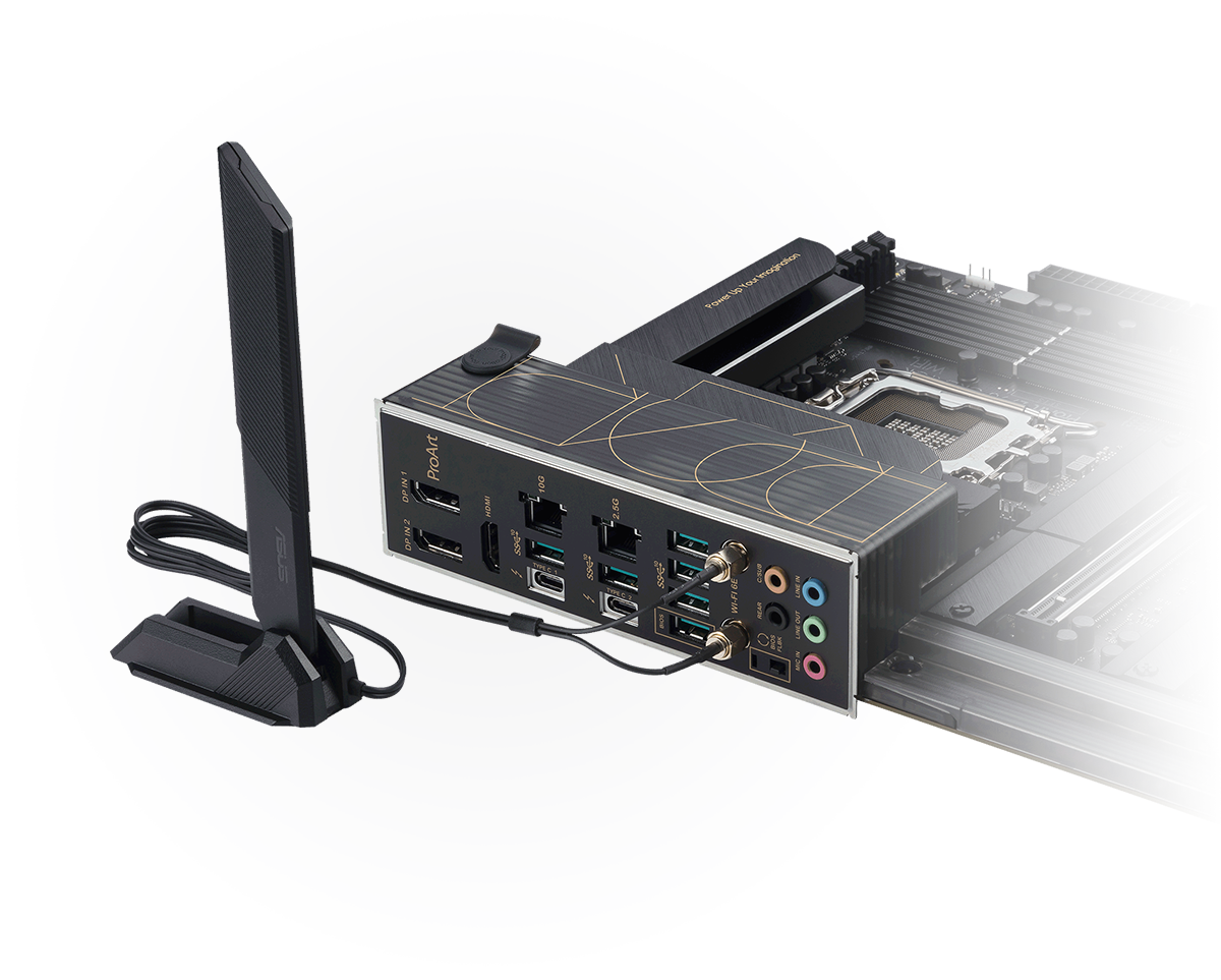 Bo mạch chủ ASUS ProArt Z790-Creator WIFI D5 tích hợp công nghệ WiFi 6E không dây có sẵn băng tần 6GHz, băng thông gấp ba lần băng tần 5GHz và có thể lên đến bảy băng tần 160 MHz để mang lại tốc độ mạng không dây cực nhanh với dung lượng được cải thiện.