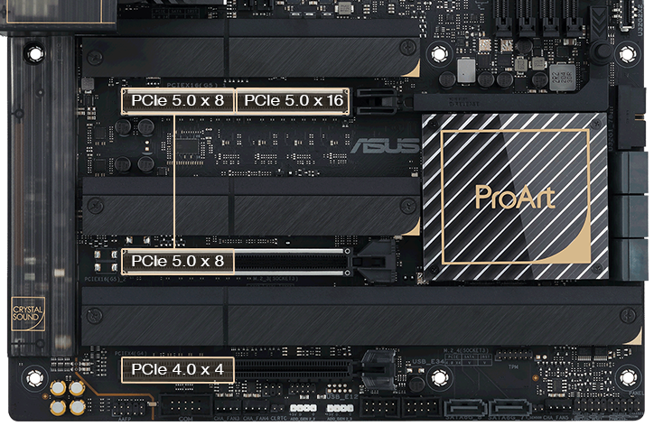 Cả hai khe cắm mở rộng x16 đều được xử lý theo chuẩn PCIe 5.0 để mang lại tốc độ đáng kinh ngạc lên đến 64 GB/giây cho các thiết bị tương thích. Để chịu được sức nặng của cạc đồ họa lớn, chúng cũng được bảo vệ bởi các giá đỡ SafeSlot và khe trên cùng có thể dễ dàng nhả ra nhờ nút Q-Release.