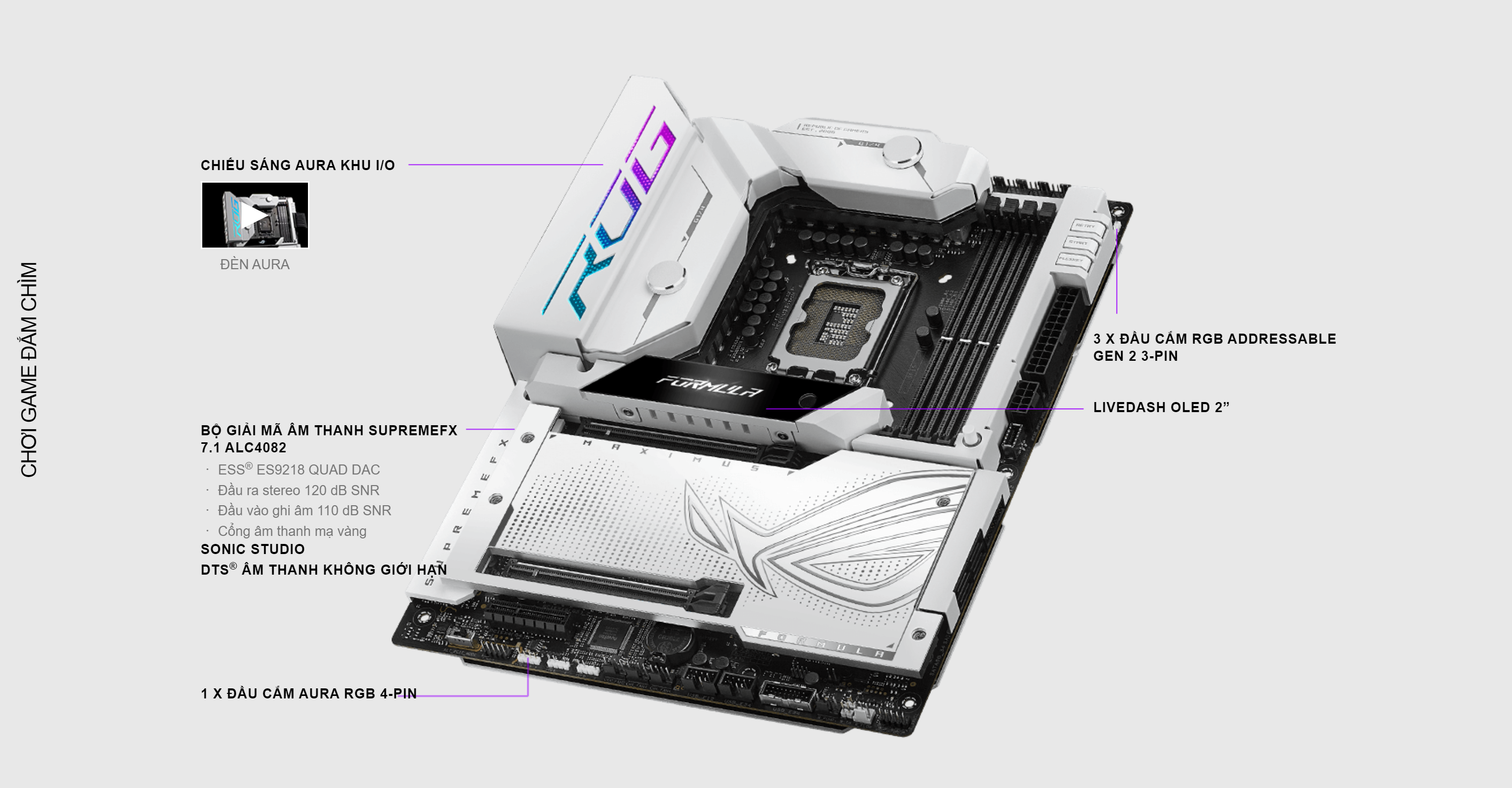 | Âm thanh | Âm thanh vòm ROG SupremeFX 7.1 Âm thanh độ phân giải cao CODEC ALC4082 - Cảm biến trở kháng cho đầu ra tai nghe phía trước và phía sau - Hỗ trợ: Phát hiện giắc cắm, Đa luồng, MIC bảng mặt trước Phân công lại giắc cắm - Đầu ra phát lại âm thanh nổi 120 dB SNR chất lượng cao và đầu vào ghi 110 dB SNR - Hỗ trợ phát lại lên tới 32-Bit/384 kHz ở mặt trước" Tính năng âm thanh - Công nghệ SupremeFX Shielding - ESS® ES9218 QUAD DAC - Giắc âm thanh mạ vàng - Cổng ra S/PDIF quang học phía sau - Tụ âm thanh cao cấp * Cổng LINE OUT ở mặt sau không hỗ trợ âm thanh không gian. Nếu bạn muốn sử dụng âm thanh không gian, hãy đảm bảo kết nối thiết bị đầu ra âm thanh của bạn với giắc âm thanh ở mặt trước khung máy hoặc sử dụng thiết bị âm thanh giao diện USB. |