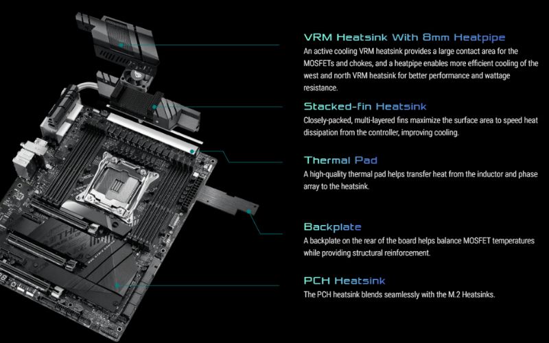 Bo mạch chủ Asus Rog Strix X299 E Gaming II được thiết kế với tản nhiệt VRM làm mát chủ động cung cấp diện tích tiếp xúc lớn cho MOSFET và cuộn cảm, đồng thời ống dẫn nhiệt cho phép làm mát hiệu quả cho hiệu suất và điện năng. hiệu suất tốt hơn. Ngoài ra, các tấm tản nhiệt với mật độ cao và nhiều lớp giúp tối đa hóa diện tích bề mặt giúp tăng tốc độ tản nhiệt, nâng cao khả năng làm mát. Bo mạch chủ này cũng có một tấm ốp lưng ở mặt sau bo mạch giúp cân bằng nhiệt độ MOSFET đồng thời củng cố cấu trúc bo mạch chủ tản nhiệt PCH kết hợp hoàn hảo với Tản nhiệt M.2. Từ đó cho hiệu năng tản nhiệt tốt hơn bao giờ hết.