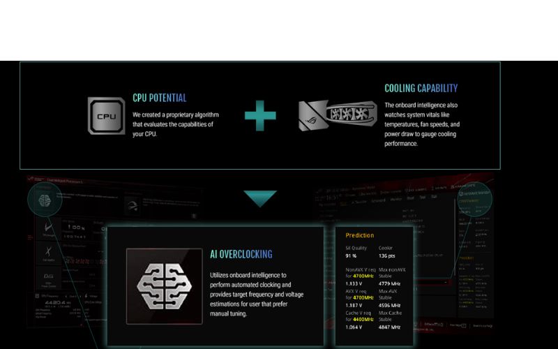 Ép xung AI trên bo mạch chủ Asus Rog Strix X299 E Gaming II giúp tự động điều chỉnh nhanh hơn và thông minh hơn bao giờ hết. Ngoài ra, cũng có sẵn trong Windows hoặc trực tiếp thông qua UEFI, với cấu hình CPU và hệ thống làm mát để có thể dự đoán cấu hình tối ưu cho từng hệ thống riêng lẻ.