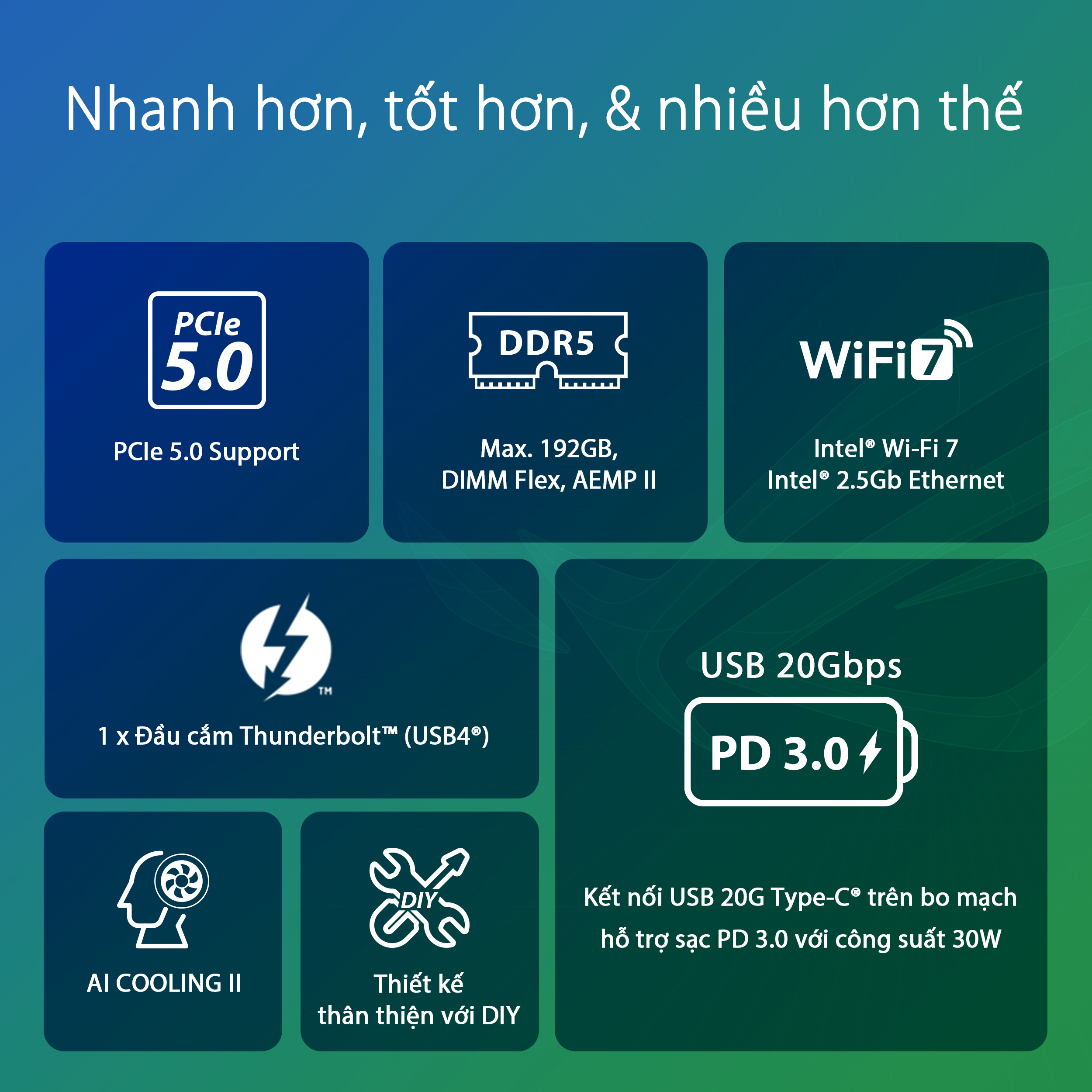| Không dây và Bluetooth | Intel® Wi-Fi 7* 2x2 Wi-Fi 7 (802.11be)** Hỗ trợ băng tần 2,4/5/6GHz*** Hỗ trợ băng thông Wi-Fi 7 160 MHz, tốc độ truyền lên tới 2,4Gbps. Bluetooth® v5.4**** * Tương thích với Windows 11 trở lên. ** Hỗ trợ đầy đủ chức năng Wi-Fi 7 MLO(Multi-link Operation) sẽ sẵn sàng trên Nền tảng Windows 11 2024 (Windows 11 24H2) trở lên. *** Quy định về băng tần và băng thông Wi-Fi 6GHz có thể khác nhau giữa các quốc gia. **** Phiên bản Bluetooth có thể khác nhau, vui lòng tham khảo trang web của nhà sản xuất mô-đun Wi-Fi để biết thông số kỹ thuật mới nhất. |