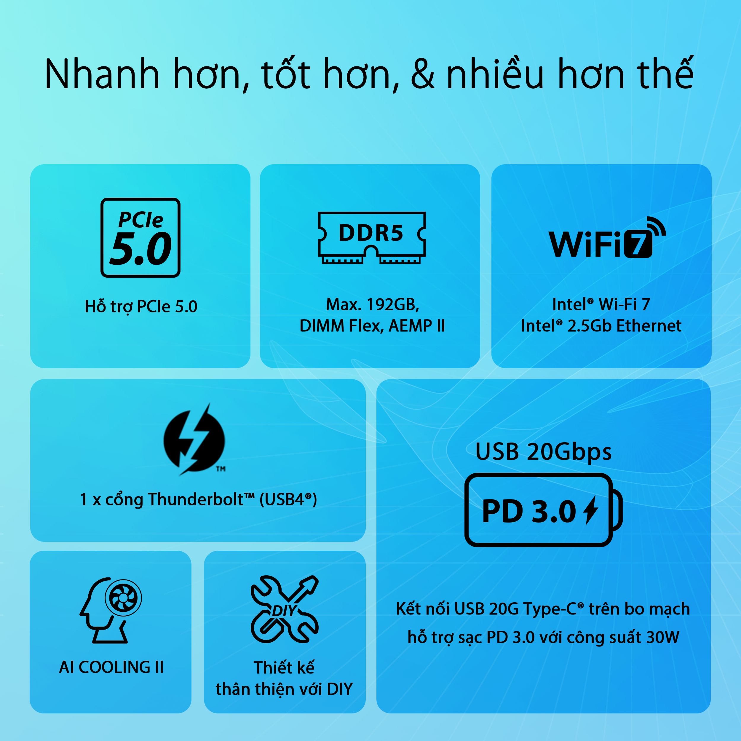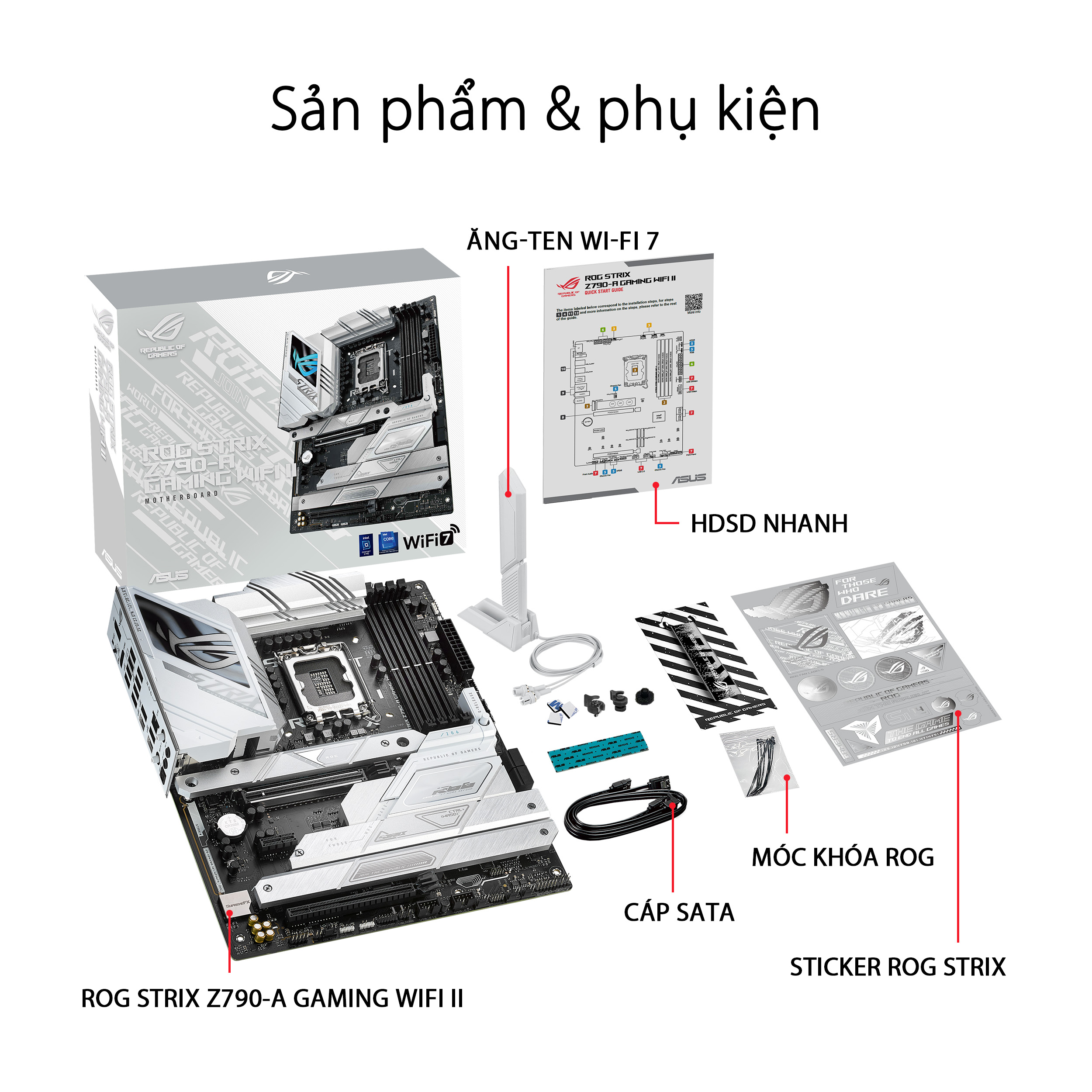 Hệ thống cung cấp năng lượng mạnh mẽ, bộ nhớ DDR5 tốc độ cao, lưu trữ nhanh chóng và hệ thống làm mát toàn diện nâng cao mọi bộ máy với ROG Strix Z790-A II là trung tâm.