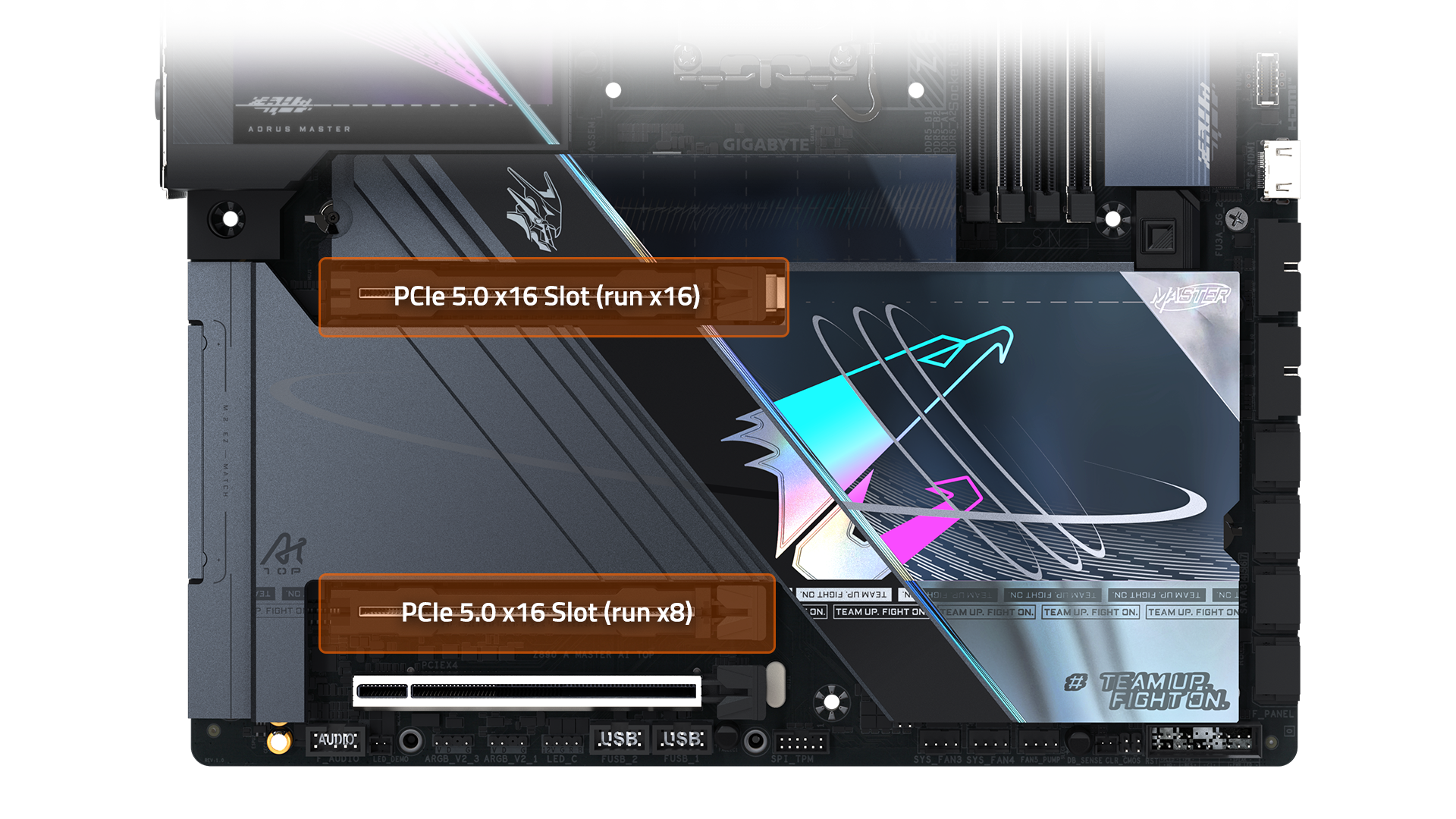 Z890 AORUS MASTER trang bị hai khe PCIe 5.0 x16 (chạy x16, x8) mang lại hiệu suất đồ họa cao cấp, giúp cải thiện khả năng render, trải nghiệm chơi game sống động hơn và hỗ trợ các tác vụ huấn luyện AI. Hỗ trợ lưu trữ nhanh với bốn khe PCIe 5.0/4.0 M.2 giúp tối ưu hóa tốc độ tính toán tại chỗ, hoàn thành các tác vụ trong thời gian ngắn nhất có thể.
