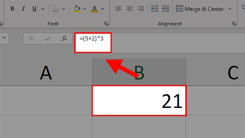 Nếu sử dụng dấu ngoặc đơn để thay đổi cú pháp, việc tính toán sẽ thay đổi. Ví dụ: Công thức sau đây cho kết quả giá trị là 21, vì nó trước tiên cộng 5 với 2, sau đó nhân kết quả với 3.