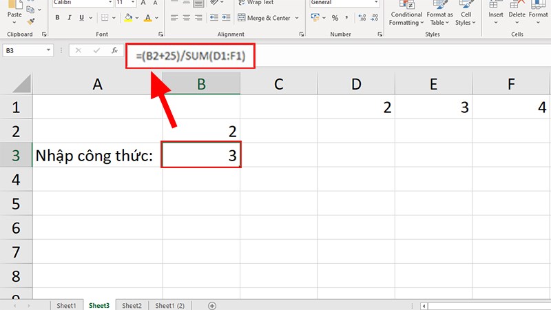 Phần công thức nằm trong dấu ngoặc đơn ở ví dụ này sẽ yêu cầu Excel tính toán B2 cộng với 25 trước, sau đó chia kết quả cho tổng các giá trị trong các ô D1, E1 và F1.