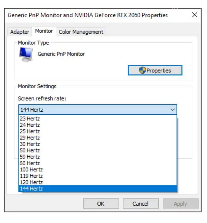 - Ở tab Monitor, chọn tần số quét phù hợp, thường là 60Hz hoặc 75Hz (theo thông số màn hình).