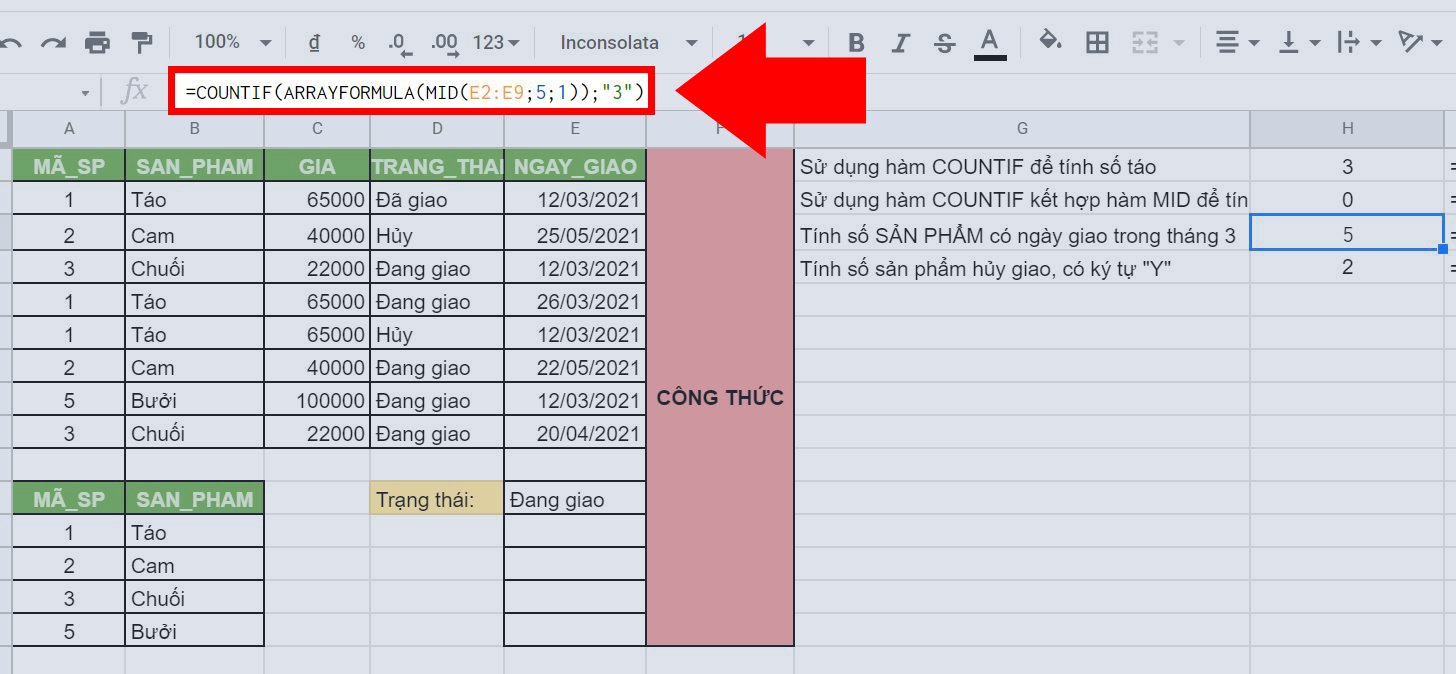 Tính số SẢN PHẨM có ngày giao trong tháng 3 như hình trên