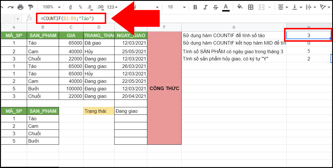 + Ý nghĩa công thức: Dữ liệu trong dải ô A2:A9 có xuất hiện 3 lần chữ "Táo". Vậy hàm COUNTIF sẽ cho ra kết quả là 3.