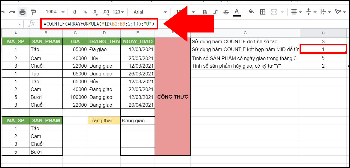 Ý nghĩa công thức: sẽ đếm số lần xuất hiện của sản phẩm “Bưởi” trong dải ô B2:B9 bằng cách đếm ký tự “Ư” ở giữa của chữ. Kết quả cho ra là 1.