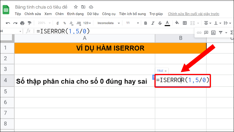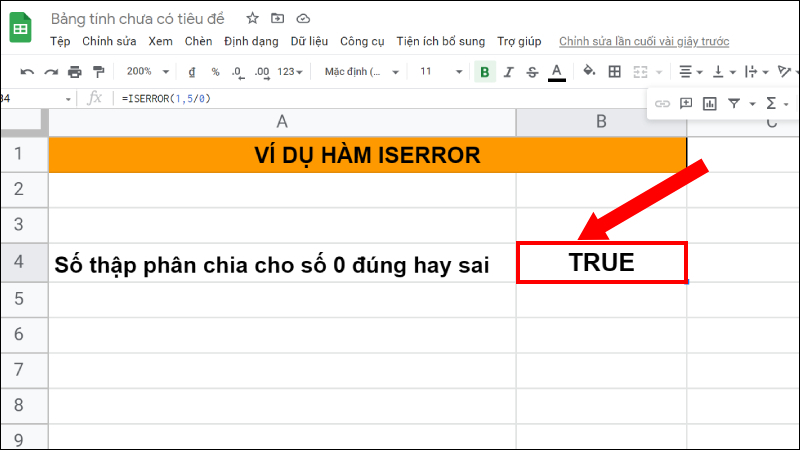Bước 1: Trong bảng Google Sheet, bạn phải nhập hàm =ISERROR (1,5/0).