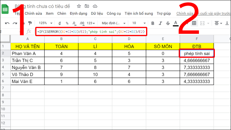 =IF(ISERROR((B2+C2+D2)/E2);"phép tính sai";(B2+C2+D2)/E2).
