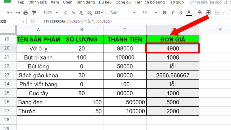 Bước 1: Nhập hàm =IF(ISERROR(C20/B20);"lỗi";C20/B20).