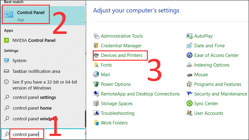 Chọn Control Panel, tìm mục Devices and Printers và chọn nó