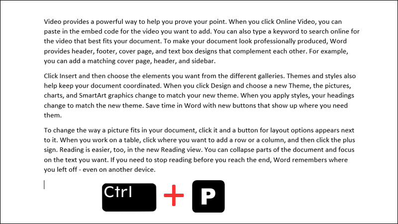 | Có thể tạo một file Word mới một cách Sau đó, sử dụng tổ hợp phím Ctrl + P để bắt đầu in tài liệu.nhanh chóng bằng cách sử dụng phím tắt Ctrl + N và sử dụng lệnh =rand(3,5) để tạo một đoạn văn ngẫu nhiên có ba đoạn và mỗi đoạn có năm câu. |