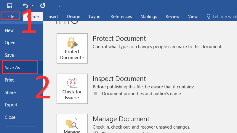 Bước 1: Khởi động file Word bị lỗi không thể in > Nhấn vào File > Chọn Lưu như.