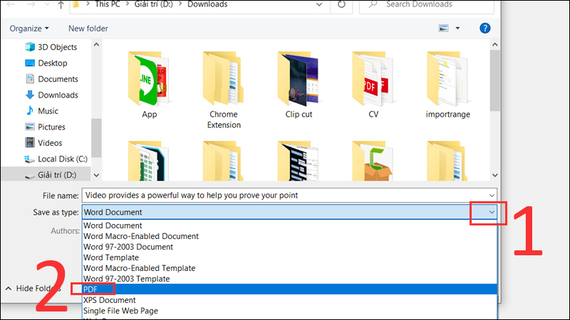 Tại đây bạn lựa chọn Save as type là PDF và lưu file lại dưới dạng file PDF