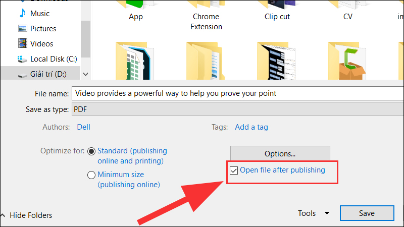 Nếu bạn muốn in tệp ngay lập tức, hãy chọn chế độ Standard, chọn vào hộp đánh dấu Open file after publishing để mở tệp ngay sau khi lưu. Cuối cùng, nhấn Save để hoàn tất.