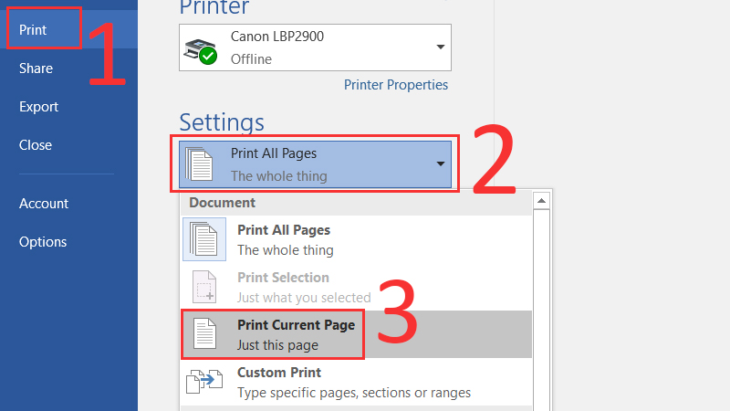 Bước 2: Chọn mục Print và chuyển đổi từ Print All Pages sang Print Current Page để in trang hiện tại.