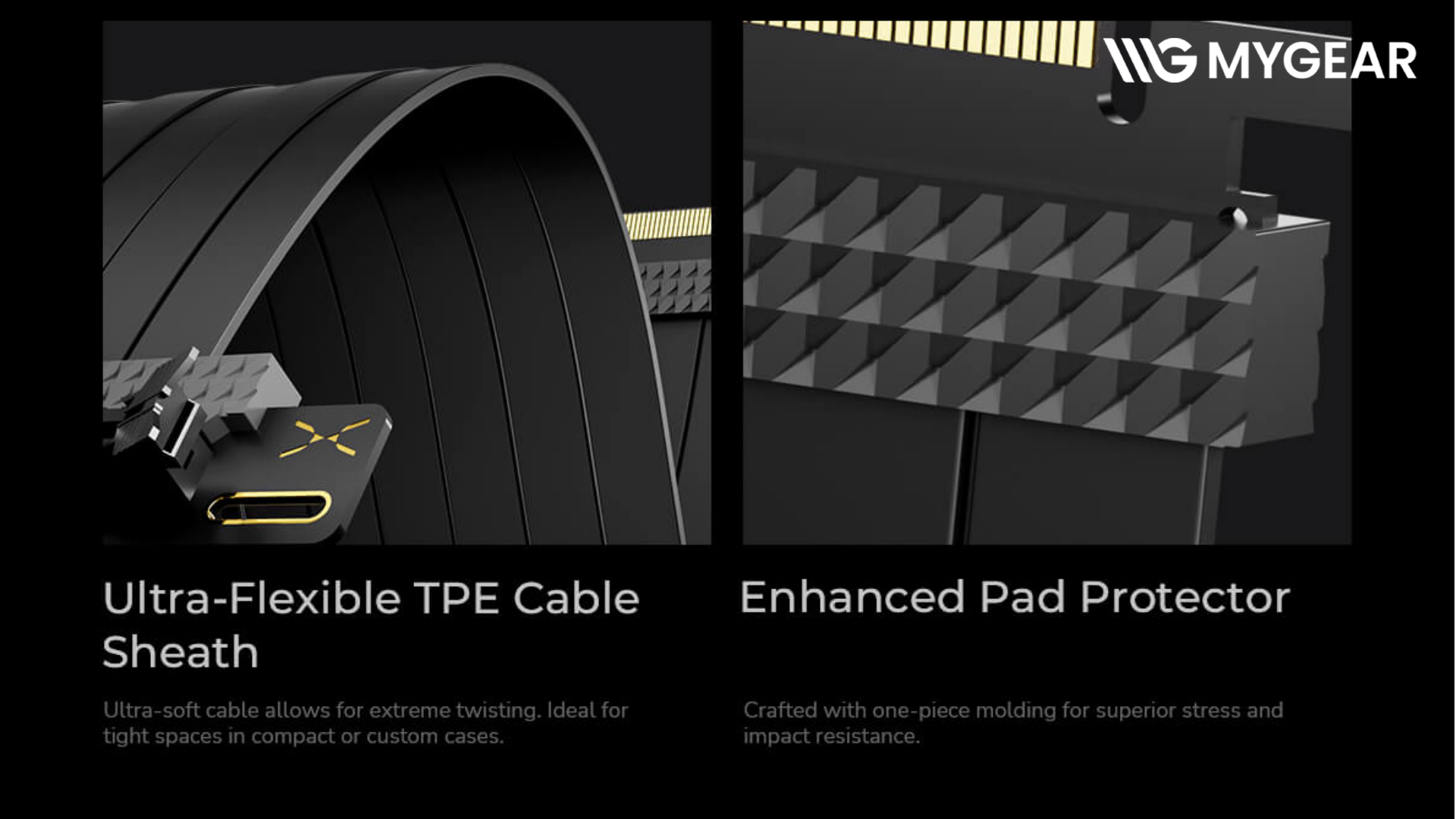 Vỏ cáp được làm từ TPE siêu linh hoạt, cho phép uốn cong nhẹ mà không làm hư hại mạch, đồng thời chân kết nối mạ vàng giúp giảm oxy hóa và đảm bảo tín hiệu GPU luôn ổn định. PCIe riser cable TRYX gần như không suy hao tín hiệu và tăng cường khả năng chống nhiễu điện từ (EMI), đảm bảo hiệu suất GPU tối đa.